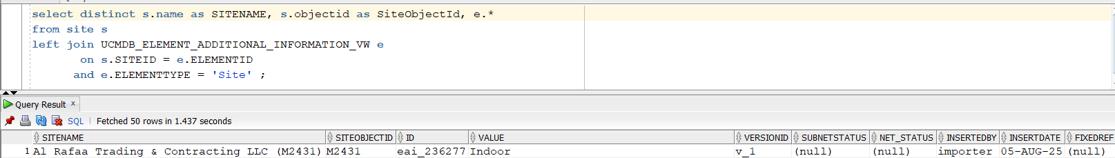 - open the details of any element: e.g. site (http://10.172.20.102:6016/ACE_UCMDB_UI/inv/site/1462/addInfo)