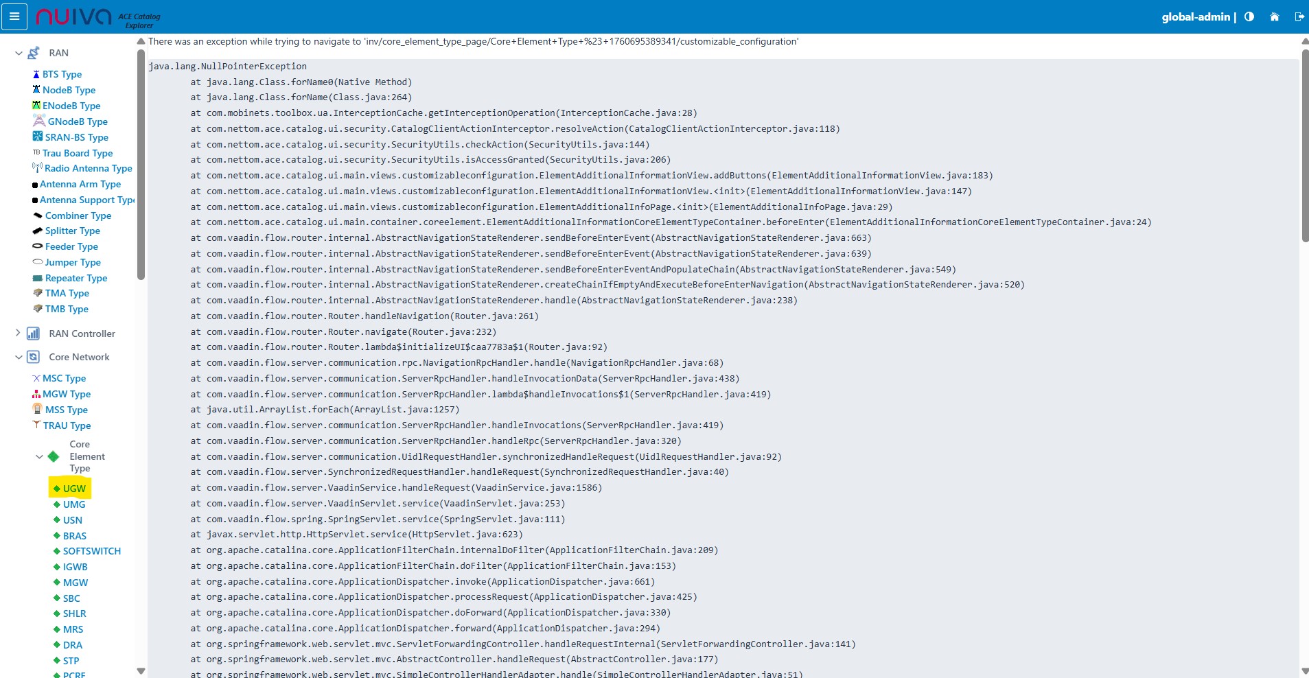 Under Costomizable Configuration - UGW Core Element categorie - Error while displaying the Customizable config.