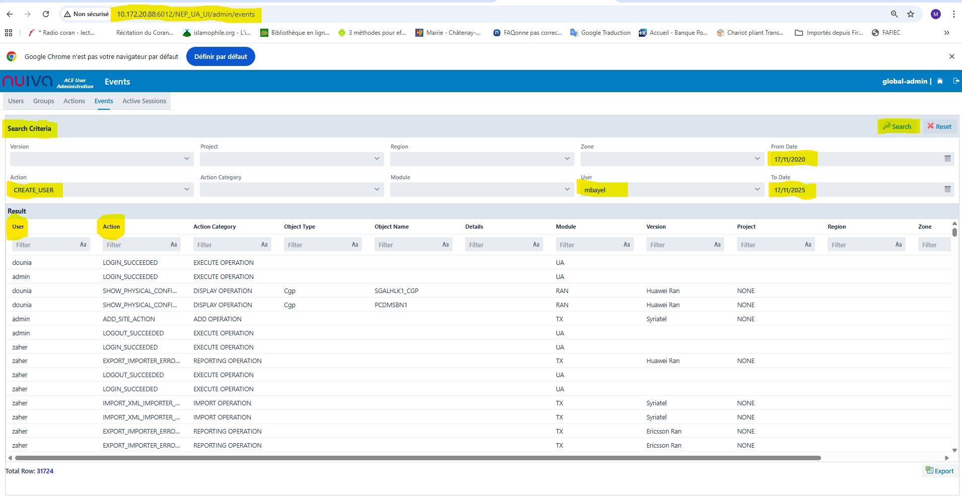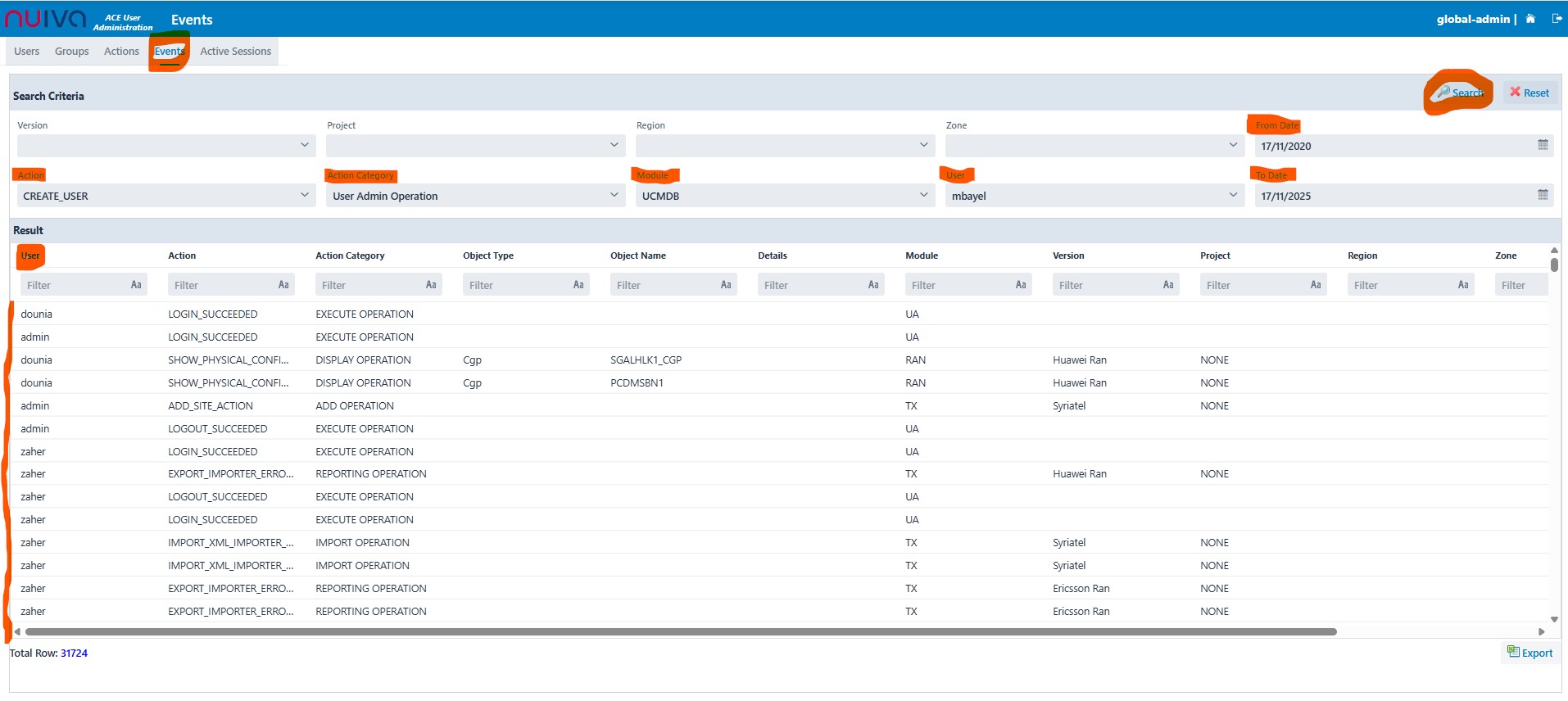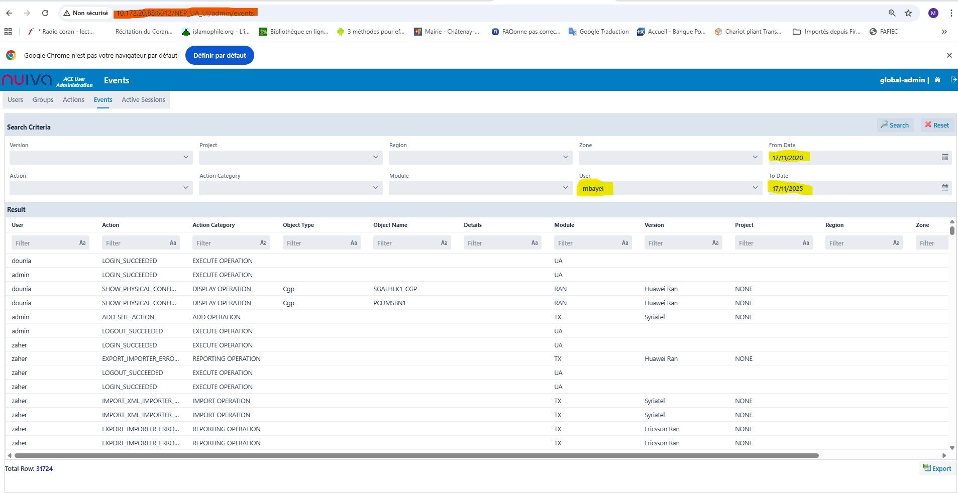 Mbaye Lo added a comment - - edited Hi Khaled, Please reassign the ticket below to Dev team. http://jira.mobinets.com/jira/browse/ACE-328?filter=-2 The issue has been tested with Omantel, everything is working, but we noted that Omantel users Logs are retrieved and shown whereas External users (tested with my VPN ID 3P00625) are not shown. Maybe the issue is an integration issue as this is related to external users only. In other words, my user ID is NOT available in user admin module at all and I have access to FN to execute operations but I'm able to execute actions without having them logged in event log. Thank you Mbaye