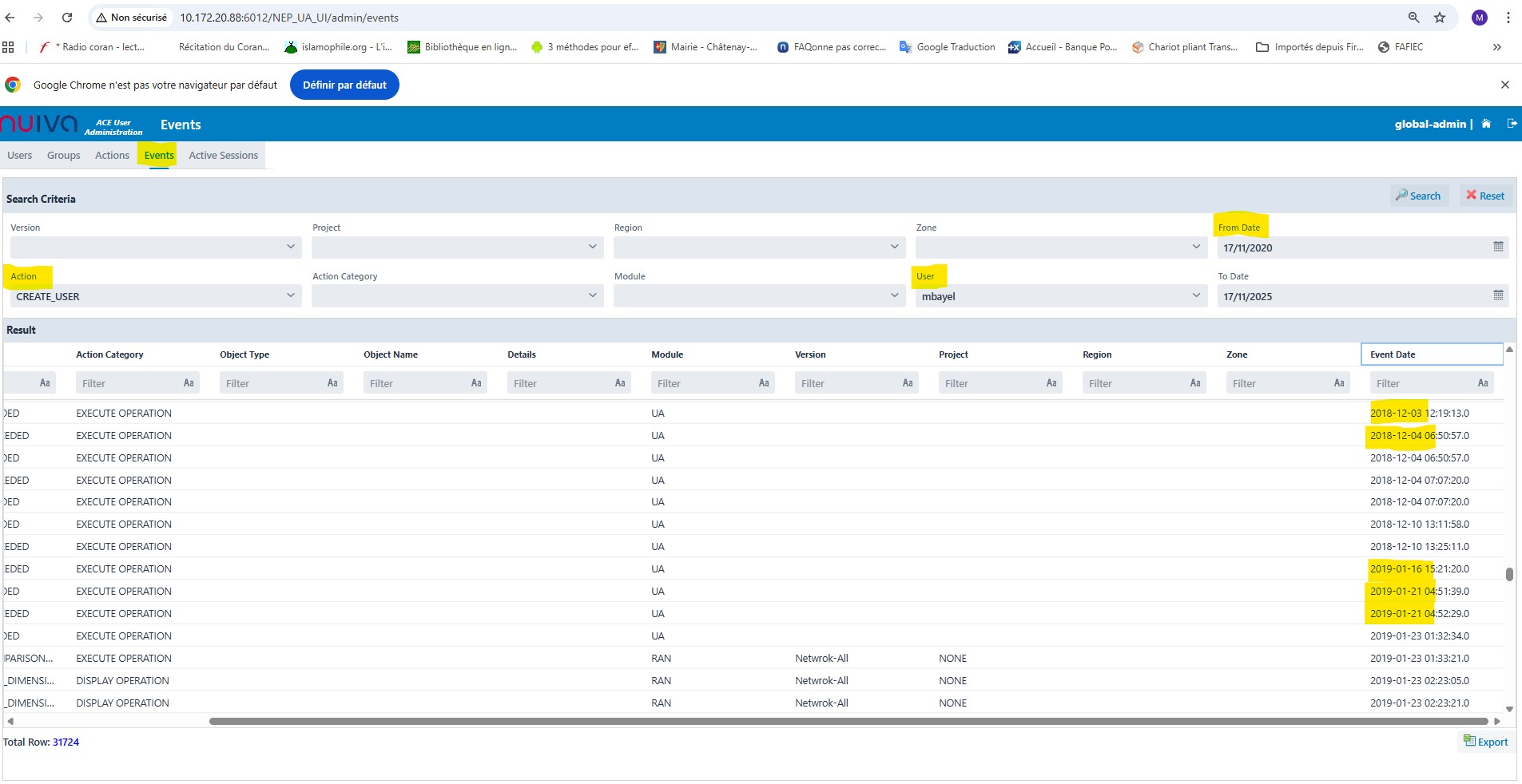 In our local UA Module, the events are not displayed according to the searsh crieria selected.