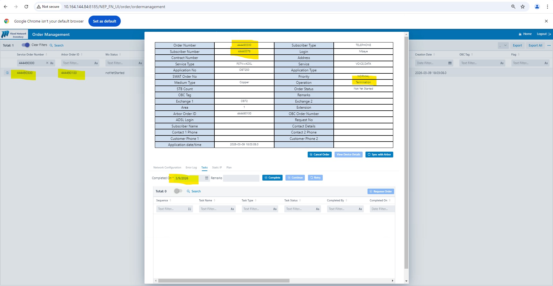 After order creation and before create any task , the process execute this task : if activeNodeType.contains("BONT") .