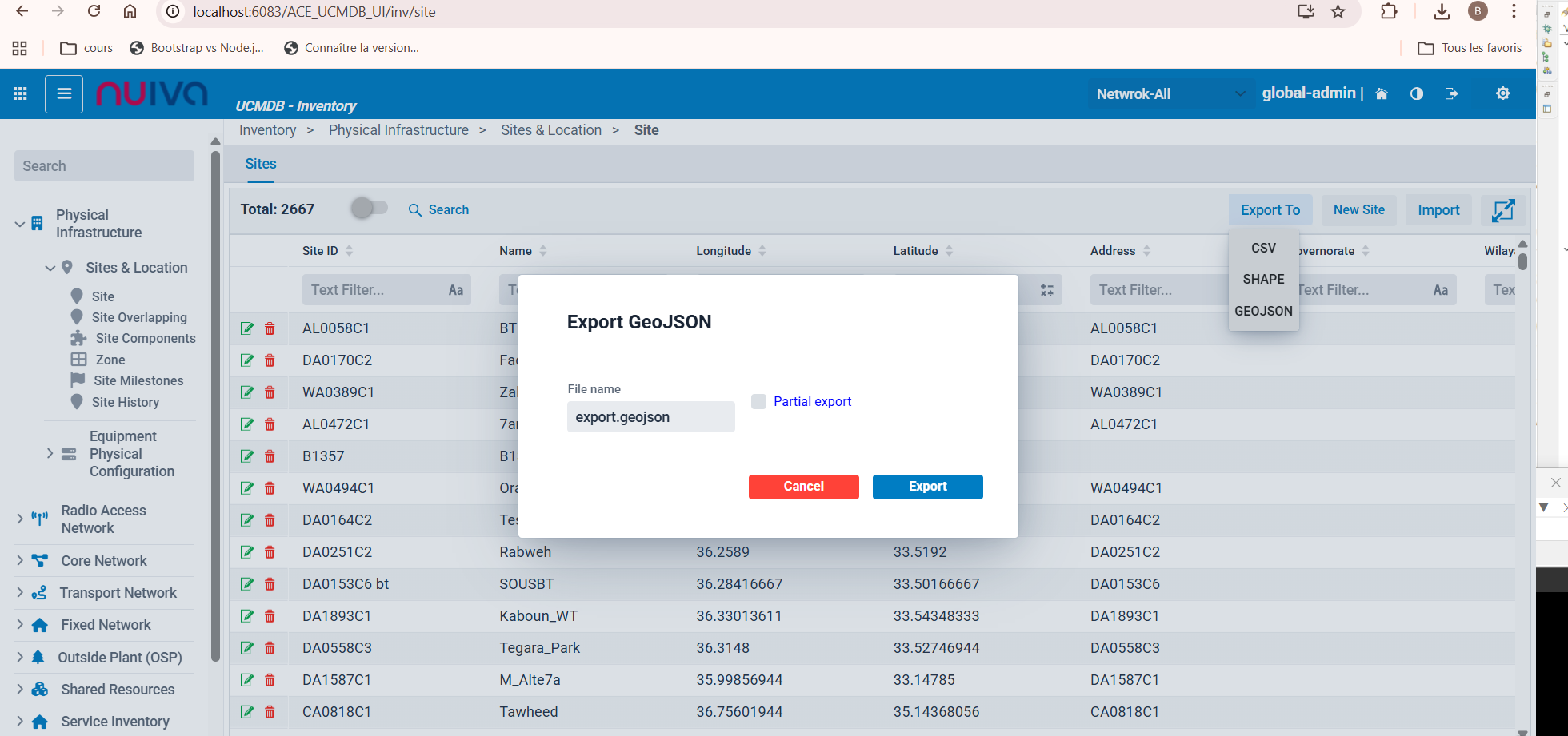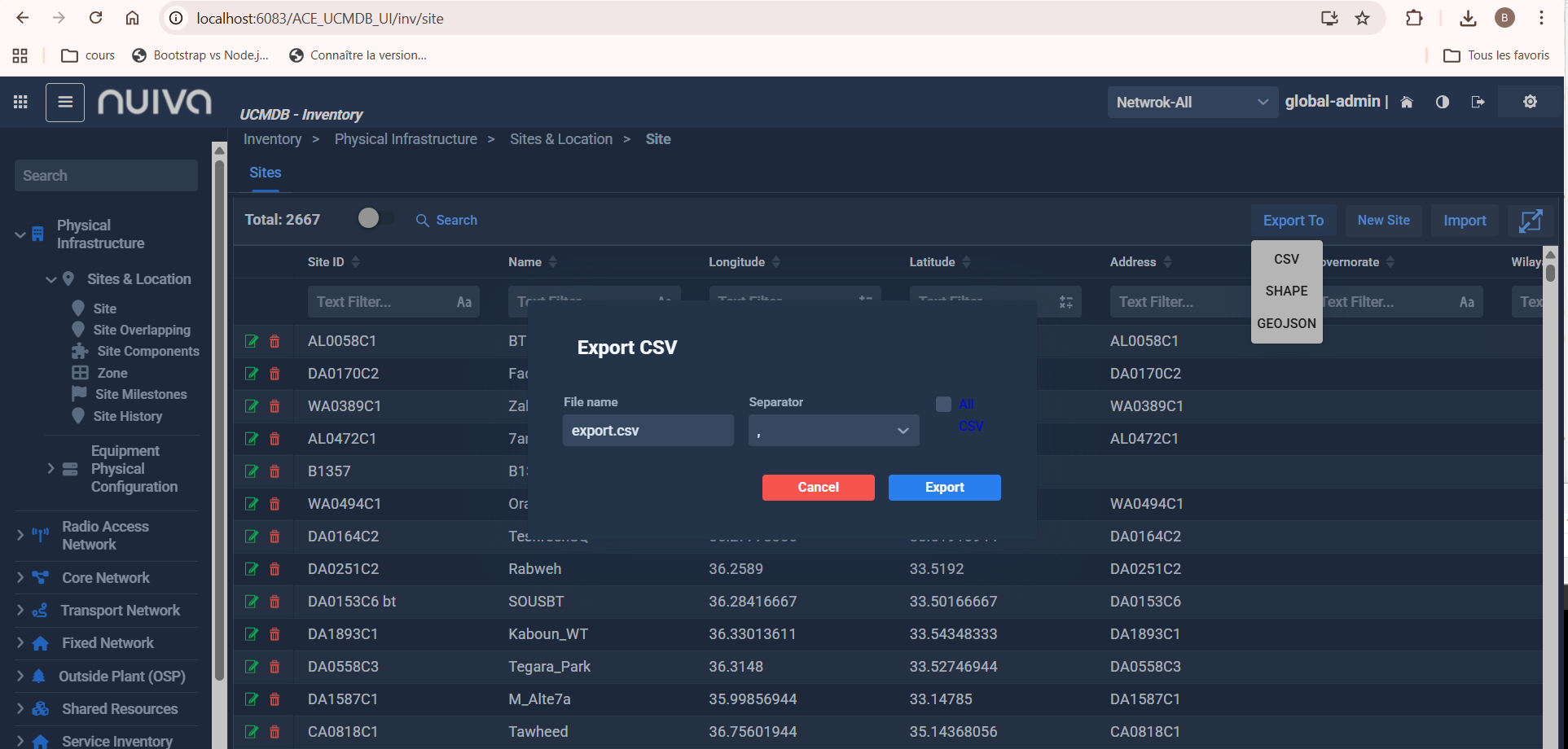 Bug description: When we click on the following path: Inventory/Site & Locations/Site/Export To/CSV et GEOJSON