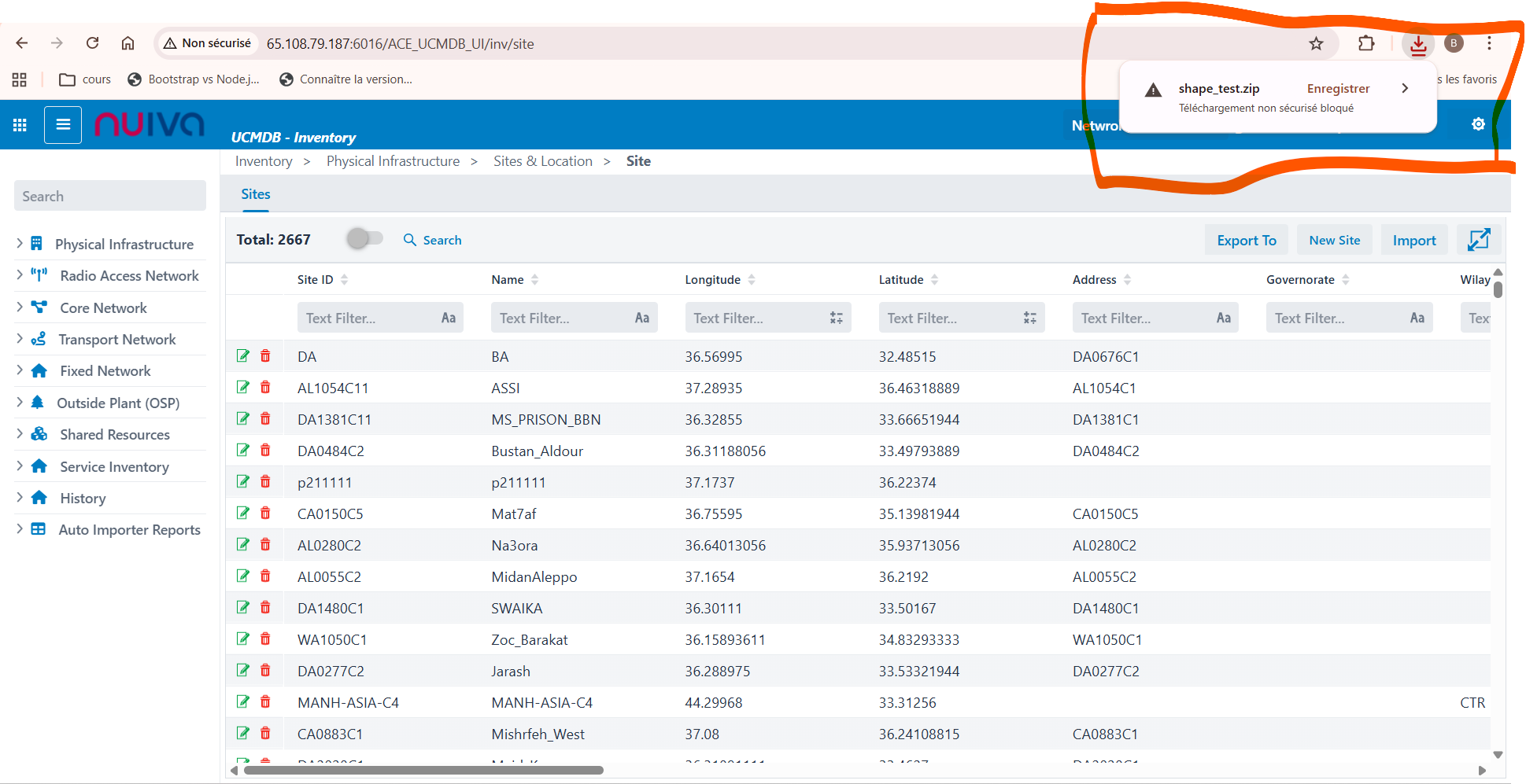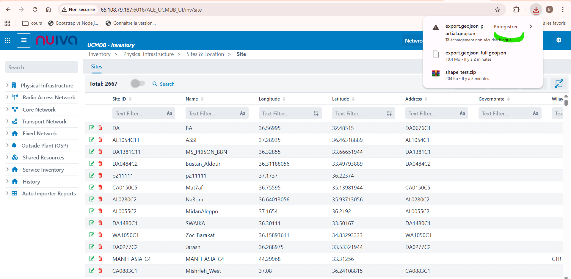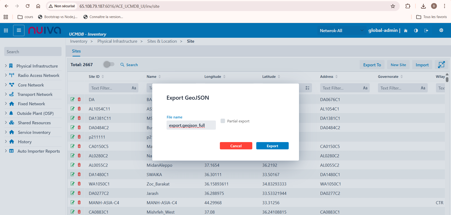 When exporting sites in GeoJson or Shape, the export fails with the message:
