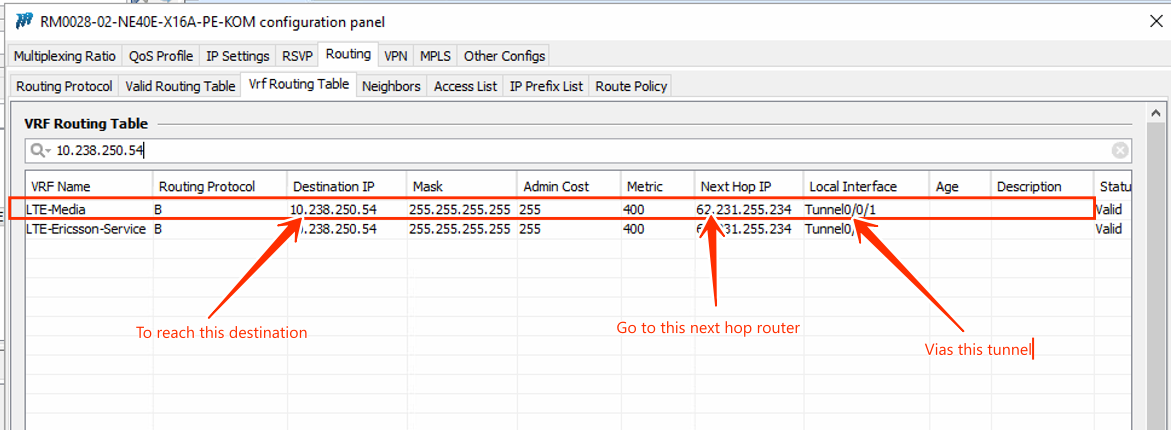 1. When encountering a routing table information withe a tunnel path the interpretation of the routing table info should be as follows. - To reach to the specified destination network - > go to this next hop router - > Via the tunnel specified. - Attached the routing table info for route of 4G node LM17130 in the router routing table. 2. The tunnel path can be determined from the tunnel path configuration information. By going thorough each next hop step by step using the routing table information. Attached the routing table info for the tunnel configuration information on a router in the path of node LM17130. 3. Corresponding NEP screenshots of the information's also attached. |