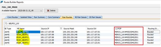 as observed , for node SRAN_ABUP01, the Route Builder report shows L2 POP as MDN31_UW, while the Site POP Path and Traffic reports are showing MDN02_UW.
