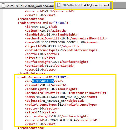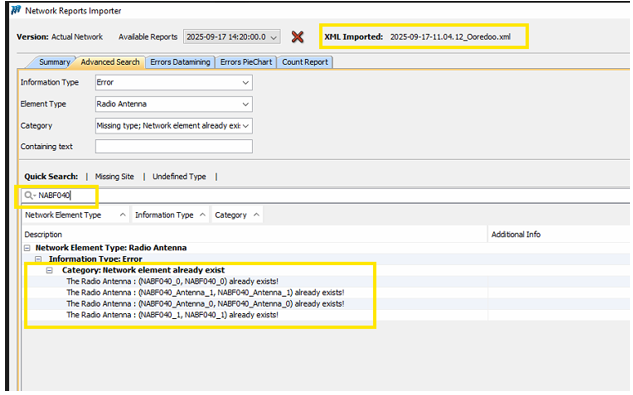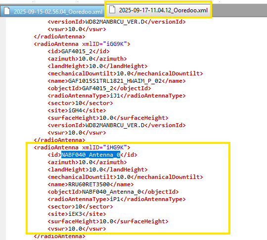 Could you please assign a NEP DEV resource to investigate the following issues: Case 1 – Error: “The radio antenna already exists” (I) Radio antennas are not imported into NEP, although they are present in the XML. (II) While troubleshooting in NEP, the error report shows that the radio antenna already exists. However, upon verification, it is not available in NEP, whereas the parent node is present. (III) Please find the required snippet for reference (example node: NABF040). NEP Error Snippet: eNodeB report Snippet: Radio Antenna Report: XML Snippet: Case 2 – Error: “The radio antenna with same ID or name exists” (I) Like Case 1, the radio antennas are not imported into NEP but are available in the XML. (II) The NEP error report indicates that a radio antenna with the same ID or name already exists, but upon checking, it is not available in NEP, though the parent node is present. Error Snippet: Radio antenna report snippet: SRAN report where node is available XML Snippet Thank you Indrasan |