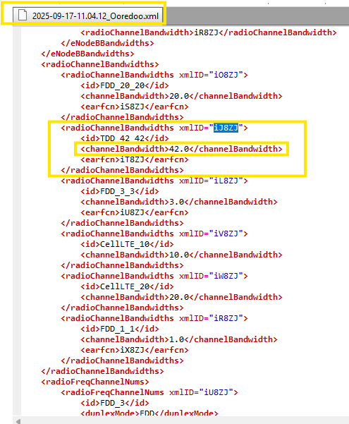 Could you please assign a NEP DEV resource to check and fix the following issue: (I) XML File: 2025-09-17-11.04.12_Ooredoo (II) Import Date: 17-09-2025 (III) Platform: .102 Issue Description: Although channel bandwidths are available in the XML, an error still appears during import. All 4G cells are successfully imported in NEP, but the error persists. For reference, I am sharing an example below. References Attached: NEP Error Snippet: Snippet of “enodebandwidths” from XML: Snippet of “radiochannelbandwidths” xml: XML-Radio channel frequency band snippet: Thank you Indrasan |