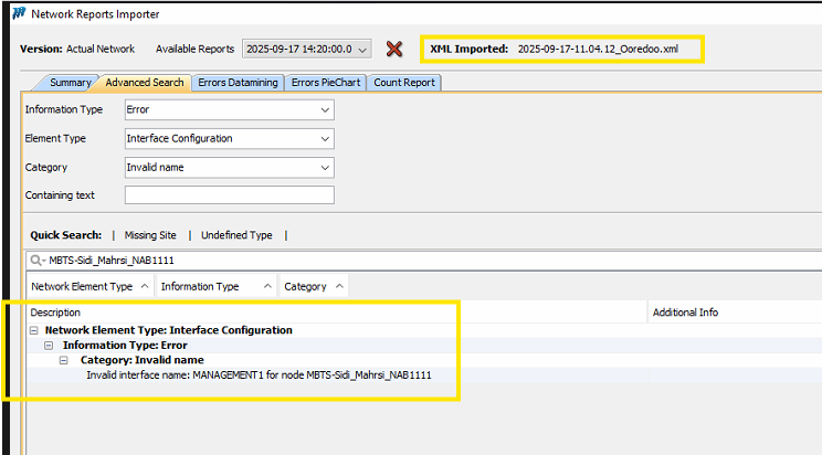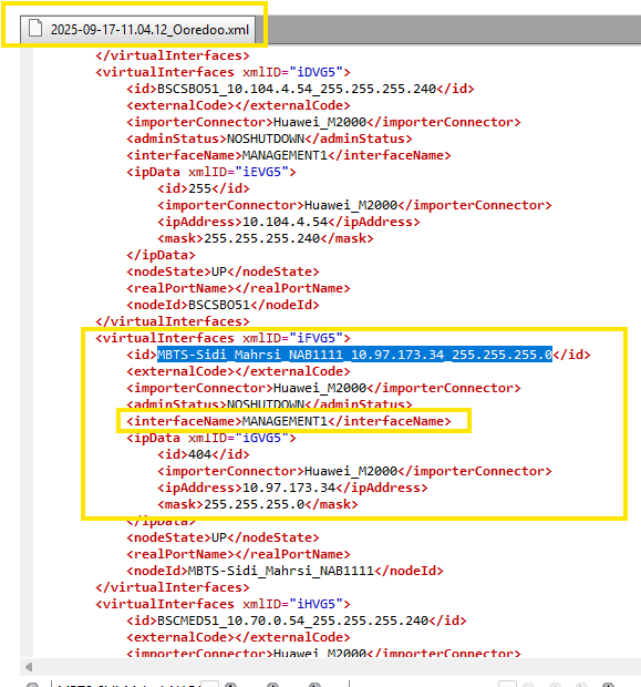 Could you please assign a NEP DEV resource to investigate the following issue regarding IP addresses not being imported? Issue Description: Virtual Interface IPs are not being imported for the nodes listed below. For other nodes with the same interface name, the IPs are successfully imported. However, errors appear in all cases. IPs Not Imported: ipAddress mask parentXmlElement parentId 10.97.173.34 255.255.255.0 virtualInterfaces MBTS-Sidi_Mahrsi_NAB1111_10.97.173.34_255.255.255.0 10.97.126.79 255.255.255.0 virtualInterfaces MBTS-TIERET_TAT1065_10.97.126.79_255.255.255.0 10.97.126.74 255.255.255.0 virtualInterfaces MBTS-S_RELAIS _LAARICHE_TAT1064_10.97.126.74_255.255.255.0 10.97.41.44 255.255.255.0 virtualInterfaces MBTS-Ste_SOPAT_MAH2010_10.97.41.44_255.255.255.0 10.97.68.9 255.255.255.0 virtualInterfaces MBTS-Aeroport TABARKA_JEN2001_10.97.68.9_255.255.255.0 Error Snippet & XML Snippet Attached Same error occurs in all cases: Attached List of IPs Imported for your reference: gateway ipAddress mask parentXmlElement parentId 10.191.0.54 255.255.255.240 virtualInterfaces BSCNAB51_10.191.0.54_255.255.255.240 10.203.23.118 255.255.255.240 virtualInterfaces RNCMNB51_10.203.23.118_255.255.255.240 10.204.19.6 255.255.255.240 virtualInterfaces RNCSOS53_10.204.19.6_255.255.255.240 10.203.29.198 255.255.255.240 virtualInterfaces RNCMNB52_10.203.29.198_255.255.255.240 10.91.0.54 255.255.255.240 virtualInterfaces BSCTOZ51_10.91.0.54_255.255.255.240 10.103.3.246 255.255.255.240 virtualInterfaces BSCMNB55_10.103.3.246_255.255.255.240 10.104.4.54 255.255.255.240 virtualInterfaces BSCSBO51_10.104.4.54_255.255.255.240 10.70.0.54 255.255.255.240 virtualInterfaces BSCMED51_10.70.0.54_255.255.255.240 10.34.0.54 255.255.255.240 virtualInterfaces BSCNAB52_10.34.0.54_255.255.255.240 10.59.0.54 255.255.255.240 virtualInterfaces BSCSIL51_10.59.0.54_255.255.255.240 10.204.20.6 255.255.255.240 virtualInterfaces RNCSOS54_10.204.20.6_255.255.255.240 10.202.29.6 255.255.255.240 virtualInterfaces RNCSFX52_10.202.29.6_255.255.255.240 10.18.0.54 255.255.255.240 virtualInterfaces BSCBIZ51_10.18.0.54_255.255.255.240 10.207.22.54 255.255.255.240 virtualInterfaces BSCZAG51_10.207.22.54_255.255.255.240 10.202.13.134 255.255.255.240 virtualInterfaces RNCSFX51_10.202.13.134_255.255.255.240 10.104.4.86 255.255.255.240 virtualInterfaces BSCSOS55_10.104.4.86_255.255.255.240 10.204.4.6 255.255.255.240 virtualInterfaces RNCSOS55_10.204.4.6_255.255.255.240 10.121.221.54 255.255.255.240 virtualInterfaces BSCKEB51_10.121.221.54_255.255.255.240 10.103.1.54 255.255.255.240 virtualInterfaces BSCKAS51_10.103.1.54_255.255.255.240 10.68.0.54 255.255.255.240 virtualInterfaces BSCJEN52_10.68.0.54_255.255.255.240 Thank you Indrasan |