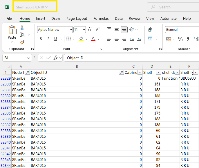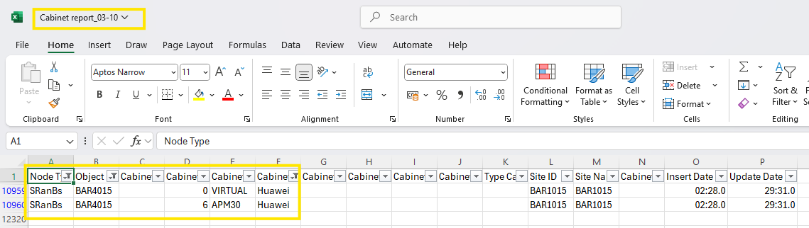 For SRAN node BAR4015, the Individual Cabinet/Shelf/Board Report shows: