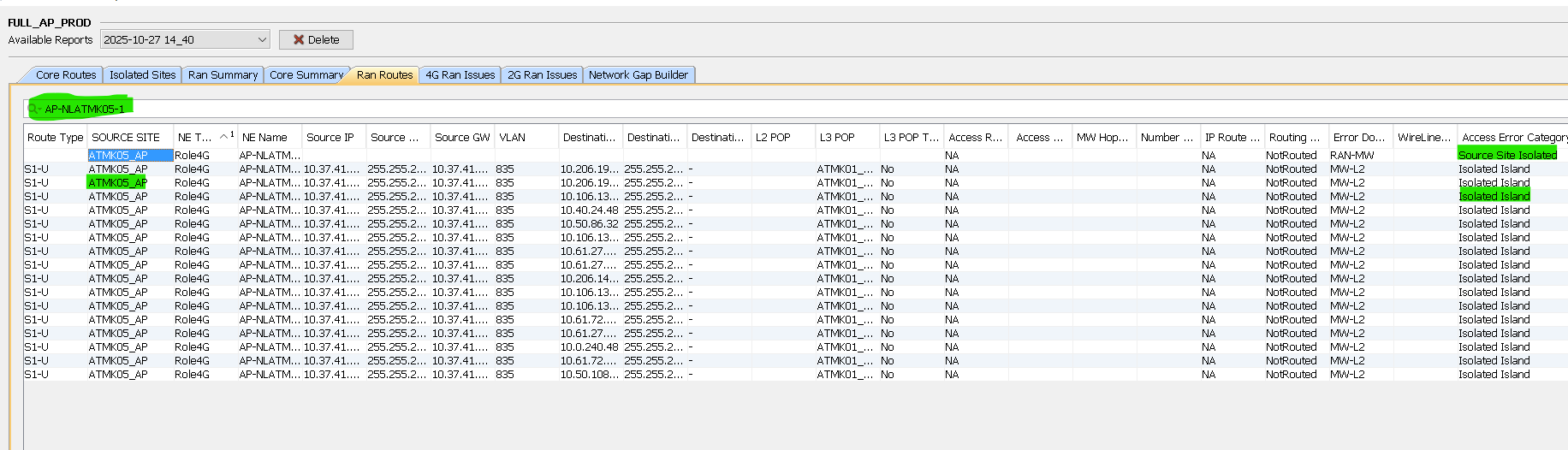 In the Routing Report, we are observing the errors “Source Site Isolated” and “Isolated Island” across multiple sites, even though MW links and Source IPs are available. A reference site from the AP Circle has also been attached for your review. Ref Node id :- AP-NLATMK05-1 site id – ATMK05_AP |