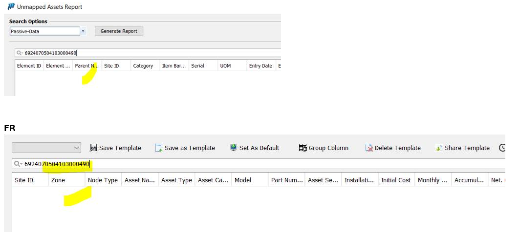 The item is available in the passive inventory and not available in both FR , WO and unmapped Report.