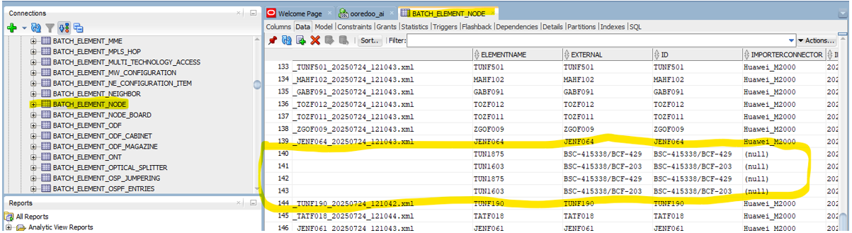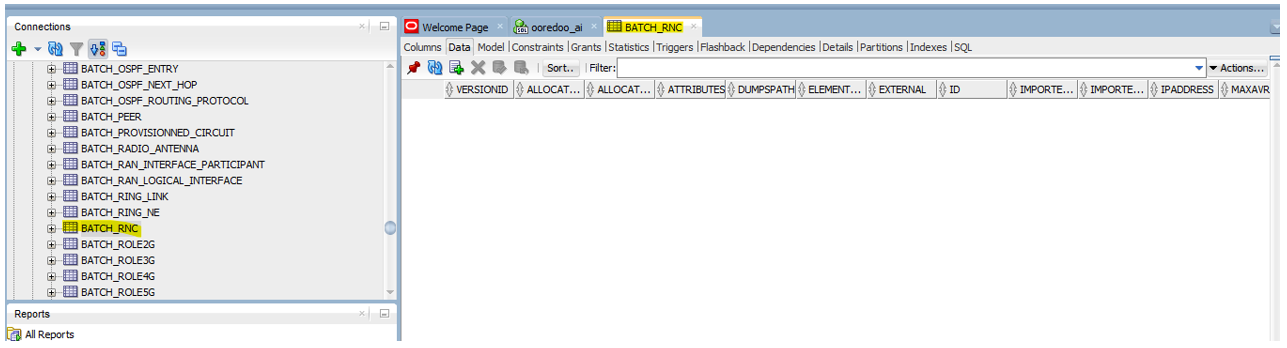 o Only the RNC table exists, but its data is blank (While data is available in CSV-Output).