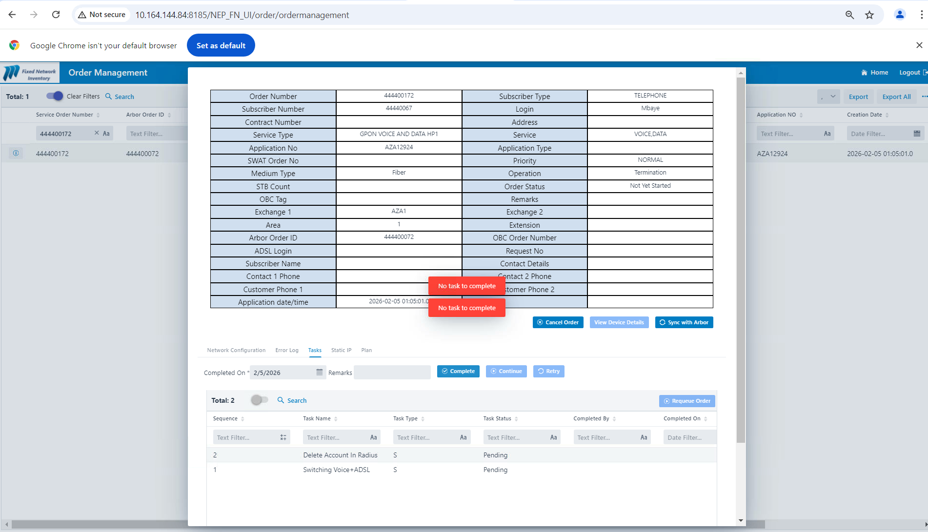 GPON Termination order is created, but we are getting Error while completing Tasks